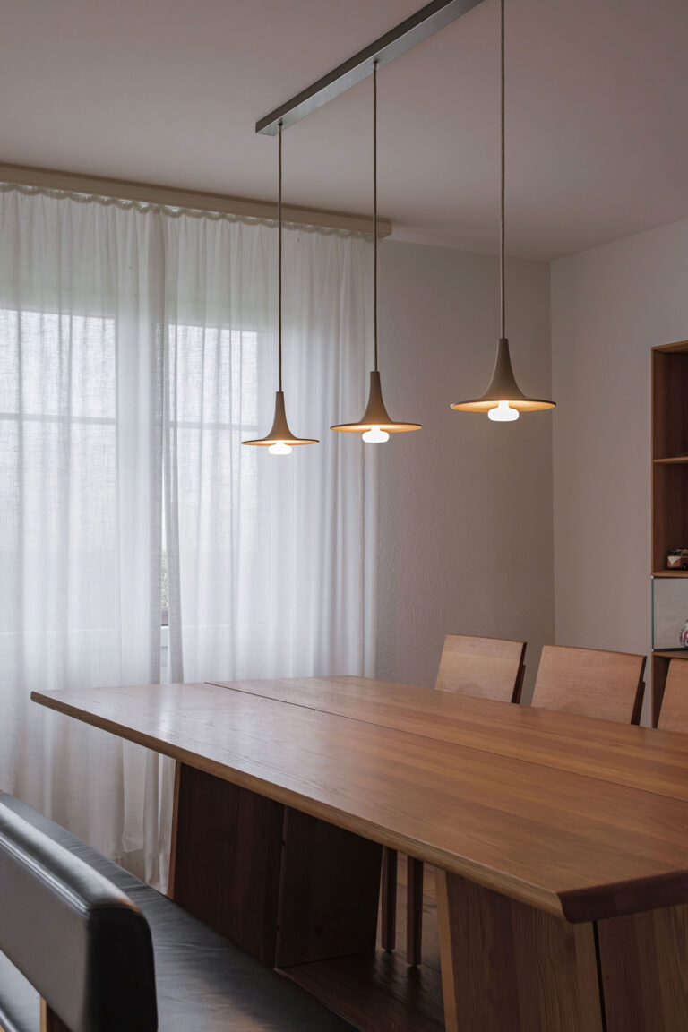 Im renovierten Wohnhaus in Oberbüren wurde bestehende Substanz mit neuen Lichtakzenten verbunden. Zum Einsatz kamen Aurea Porzellan, Andromeda Natural und Callisto Natural – Leuchten, die mit ihren sanften Lichtbildern und natürlichen Oberflächen Wärme und Ruhe in die Räume bringen.