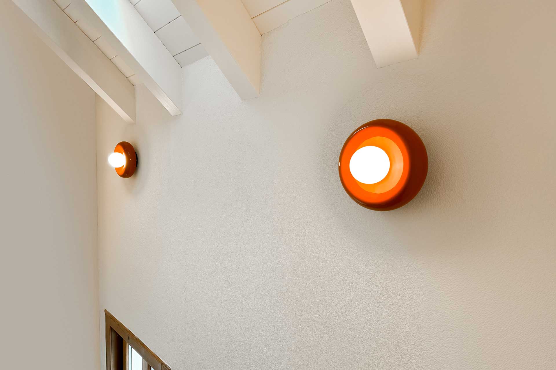 Zum Einsatz kamen unsere Mizar S und Mizar M in Speckled White sowie die Wandlampe Orbis in Earth. Die Formen und Oberflächen der Leuchten nehmen den Stil und die Materialität der 70er-Jahre auf, und schaffen so eine Lichtstimmung, die den ursprünglichen Charakter des Hauses respektiert.
