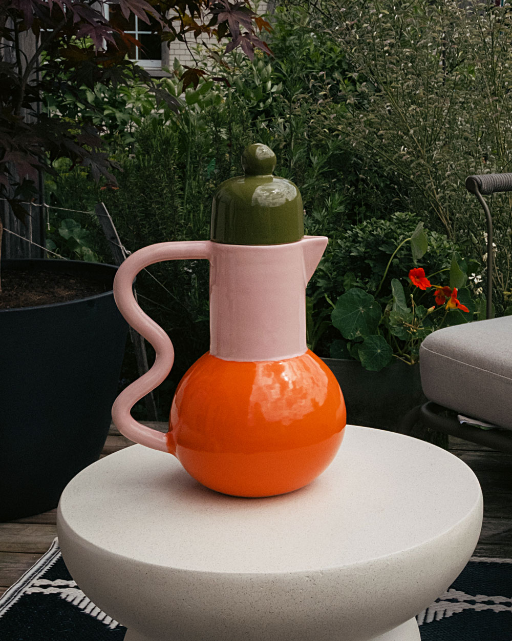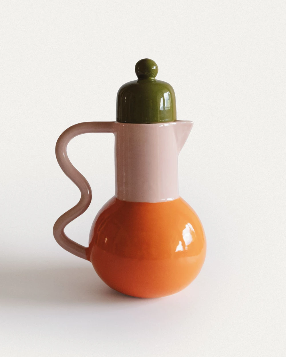 Ein sommerlich verspielter Keramikkrug in den Farben Rose, Tangerine und Olive. Die organisch geschwungene Form und der farblich abgestimmte Deckel machen ihn zu einem besonderen Stück für Tisch und Regal. Ob für Wasser, Limonade oder einfach als dekoratives Objekt – dieser handgefertigte Krug bringt Farbe und Charakter in dein Zuhause. Jedes Exemplar ist ein Unikat, das in sorgfältiger Handarbeit entstanden ist.
