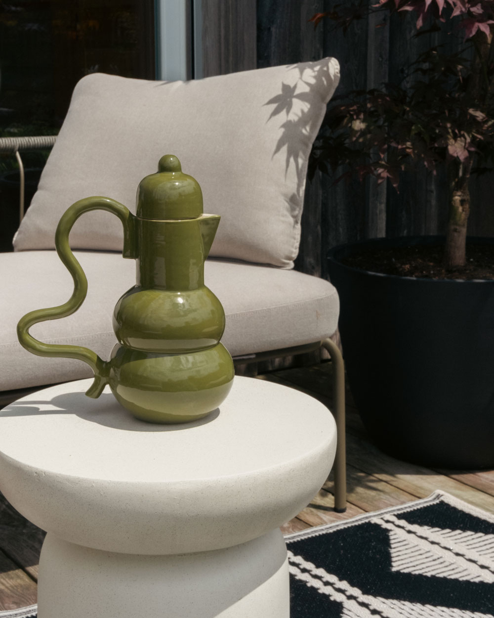 Zurückhaltend in der Farbe, dafür umso spannender in der Form: Dieser Krug in sattem Olive zeigt sich in ruhiger Präsenz. Die weiche Linienführung und der schlichte Deckel ergänzen sich zu einem eleganten, alltagstauglichen Einzelstück. Ideal für Wasser, Tee oder als Vase verwendbar – handgefertigt mit Blick fürs Detail.