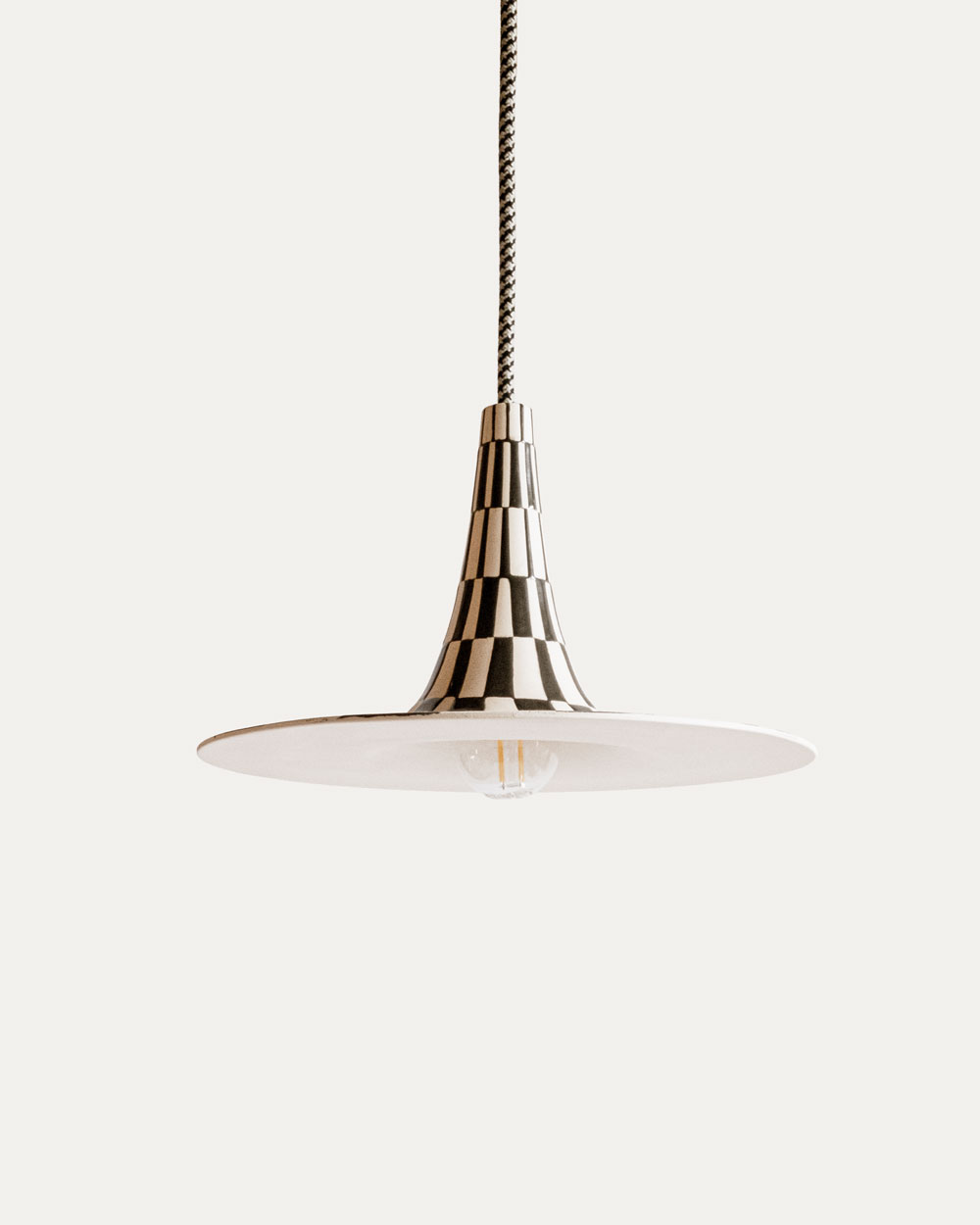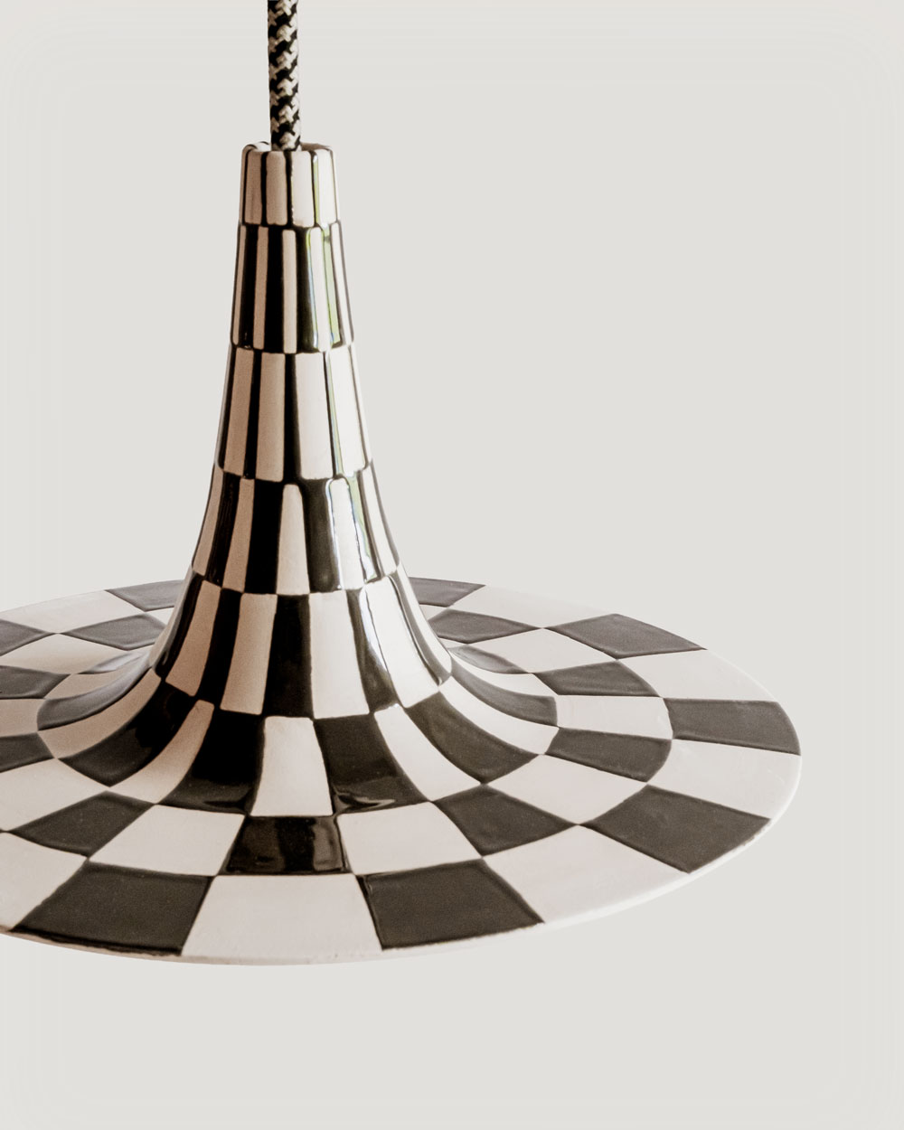 Andromeda Karo – Special Edition verbindet grafisches Design mit handwerklicher Keramikkunst. Die Pendellampe mit schwarz-weisser Karoglasur setzt ein stilvolles Statement und bringt moderne Eleganz in jeden Raum.