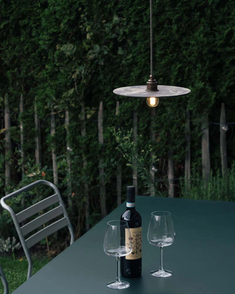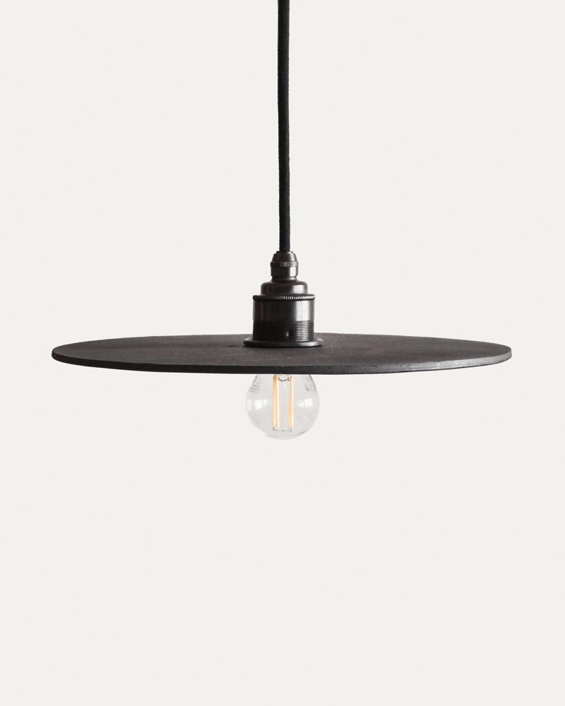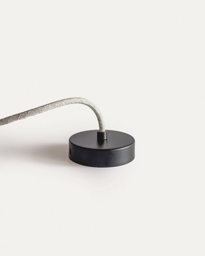 Minimalistische, handgefertigte Keramik Pendellampe Deimos mit stilvoller, dezenter Metall-Fassung, Textilkabel und Deckenbaldachin in diversen Farben.