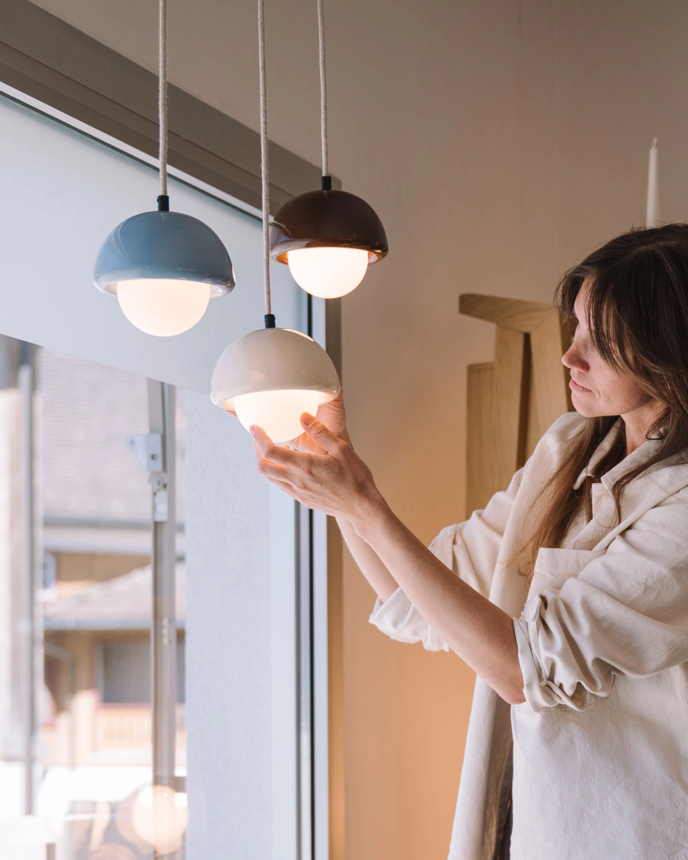 Durch dieses Zusammenspiel entsteht eine ausgewogene Balance von Material, Volumen und Licht. Das Licht tritt weich nach unten aus, wird durch die abgerundete Keramikkante sanft begrenzt und gleichmässig in den Raum geführt. So entsteht eine angenehme, blendarme Lichtwirkung mit ruhiger Präsenz – zurückhaltend und gleichzeitig prägend für den Raum.