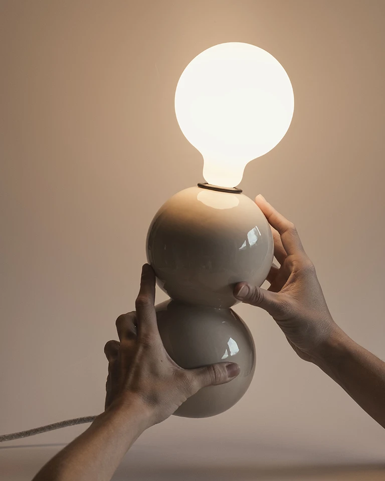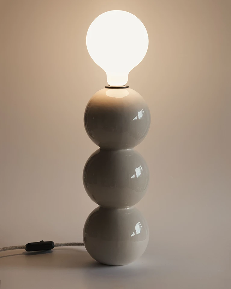 Die Keramik Tischlampe Astra ist in zwei Grössen erhältlich – M und L – die jeweils aus zwei oder drei identisch grossen Kugeln bestehen, gekrönt von einer weiteren Kugel als Glühbirne.