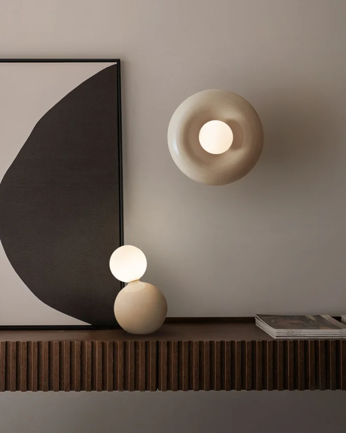 Die handgefertigte Wandlampe Orbis aus Keramik bringt architektonische Ruhe und gleichmässige Lichtwirkung in jeden Raum.